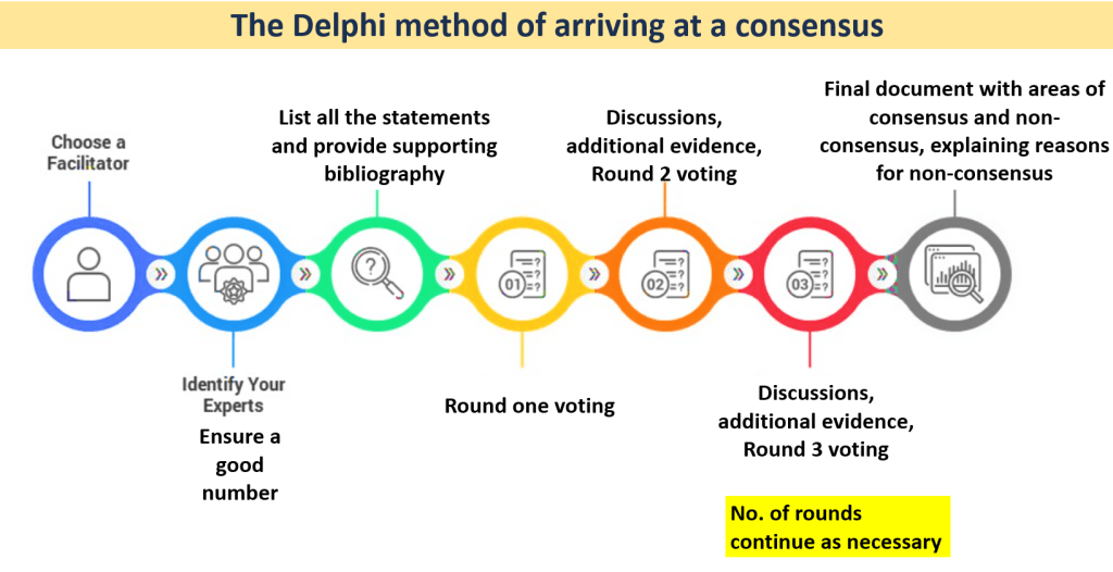 While most consensus-based manuscripts claim that the consensus was arrived at using a ‘modified’ Delphi process, there is no standard definition of a ‘modified’ Delphi process. Hence, the outcomes of such initiatives are often not considered robust, and leading journals usually reject such publications.