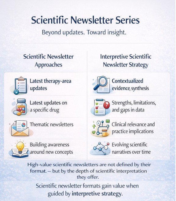 Medical affairs and marketing need to brainstorm and come up with topics relevant to a clinician, such that reading the content makes him/her feel like exploring the topic further or giving a thought to implementing the concept in clinical practice. Usually, scientific newsletters should aim at sharing newer concepts and data related to a product (not a brand) or disease area. The objective should be to build HCP relationships through scientific engagement. Stay away from trying to sell your brand through a scientific newsletter.
