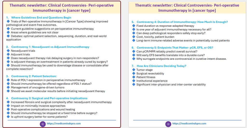 “Clinical Controversies: Peri-operative Immunotherapy in [Cancer Type]”. Each edition (5-6 pages) can focus on one controversy, with published evidence. Such newsletters are relevant, practical, and worthy of clinicians’ time. Here is an example of such a newsletter covering 7 editions.