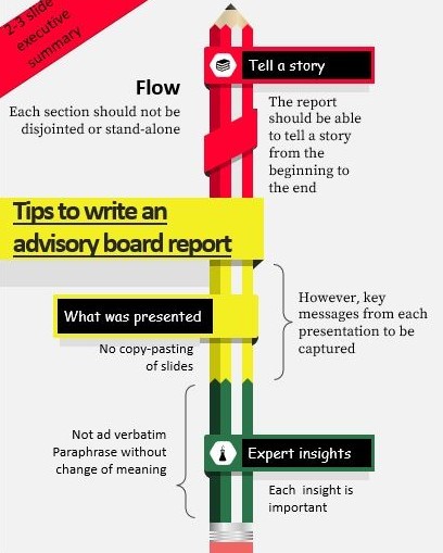 - To conclude, an advisory board report should appear as a highly professional document worthy of being shared with the seniormost level of the management in the organization and also make the experts feel that their insights have been captured very well and it has been worth the time they have spent preparing for the meeting as well as participating in a meeting.