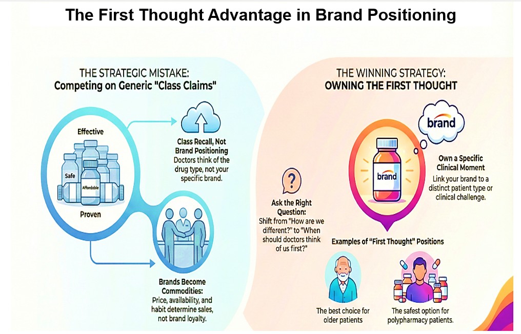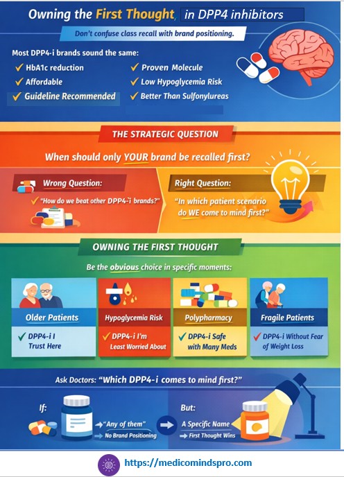 Hence, “Owning the First Thought” matters for a DPP4-i brand. A brand should own the specific clinical moment that triggers recall. Some examples:
