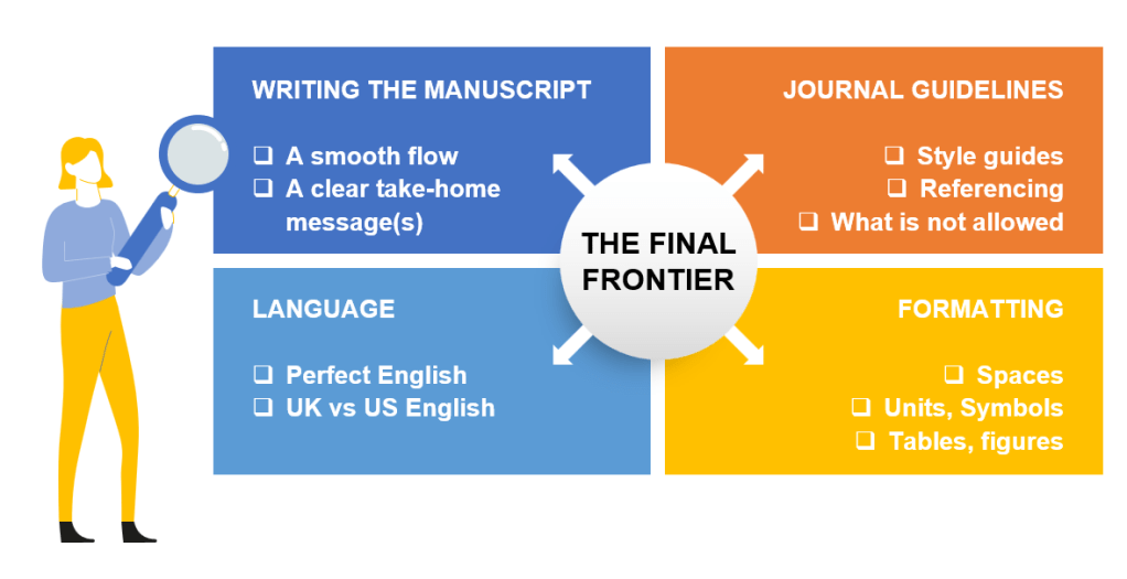 Citations: There are very very specific guidelines for these – e.g., superscript, brackets, parentheses, first author name with the year, first two authors’ names with the year. It also needs to be checked whether the punctuation marks (periods, commas, colons, semi-colons) are to be placed after the citation or before. Whether there should be a space before the citation.