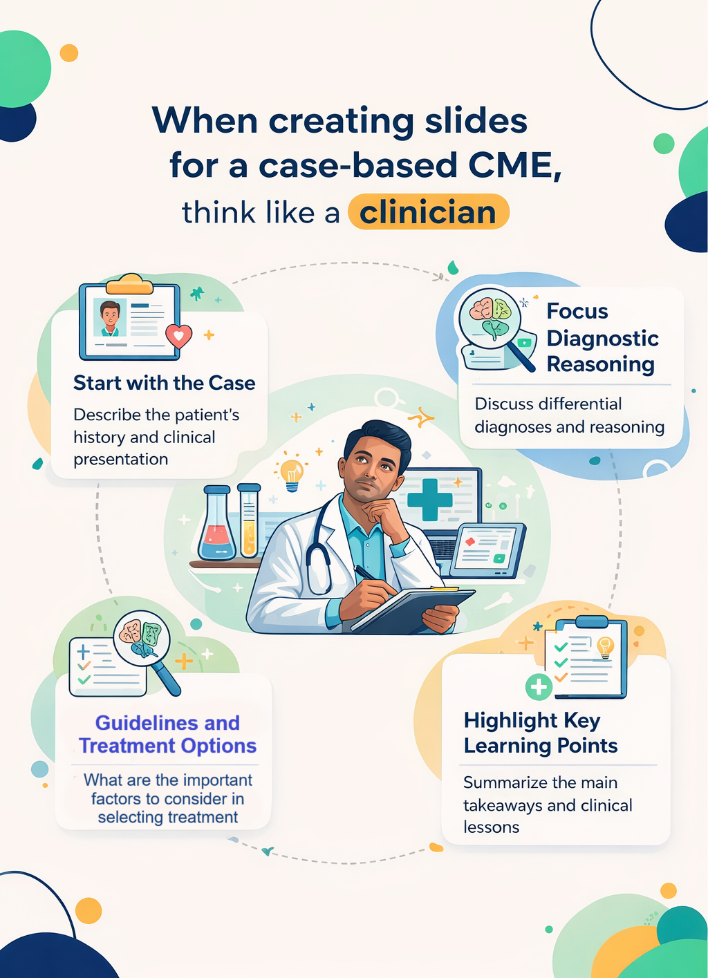 The approach in a case-based CME should mirror how a clinician would think in real-world settings. Here is a flow for a case-based CME slide deck that works very well.